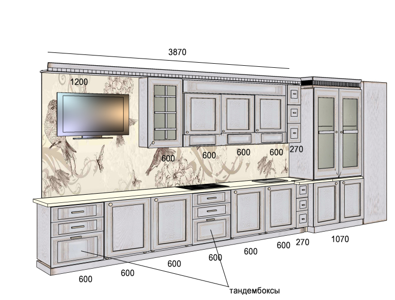 Здравствуйте! А нельзя никак на месте буфета расположить Мойку??? Я очень мучительно и долго рожала свою кухню. Зато сейчас очень довольна. Присоединяюсь к мнению, что лучше побольше выкатных ящиков делать, намного удобнее. Я по этому поводу спорила с мужем целый год, моя взяла. Теперь он понял, что я права!!! Смотрю на проект и мне совсем не нравится, что варка рядом с телевизором!!!! Все равно парить будет, может тогда варку к буфету?