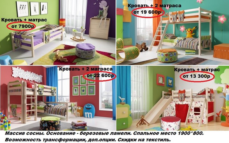 Как раз массив сосны, несравнимо с Икеа. Трансформер (можно подбирать комплектацию и в дальнейшем сделать из 2 кроватей 1 двухъярусную или наоборот разобрать 2-ярусную на 2 отдельные, игровые варианты с горкой и пр)