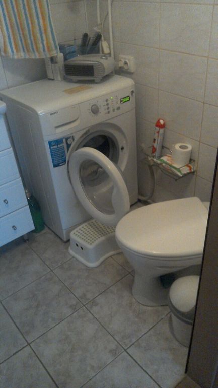 При таком расположении- за унитазом стоит небольшое ведро для полов, с другой стороны ершик и ведро для бумаги, машинка спокойно открывается полностью и на унитазе удобно, никуда не упираешься