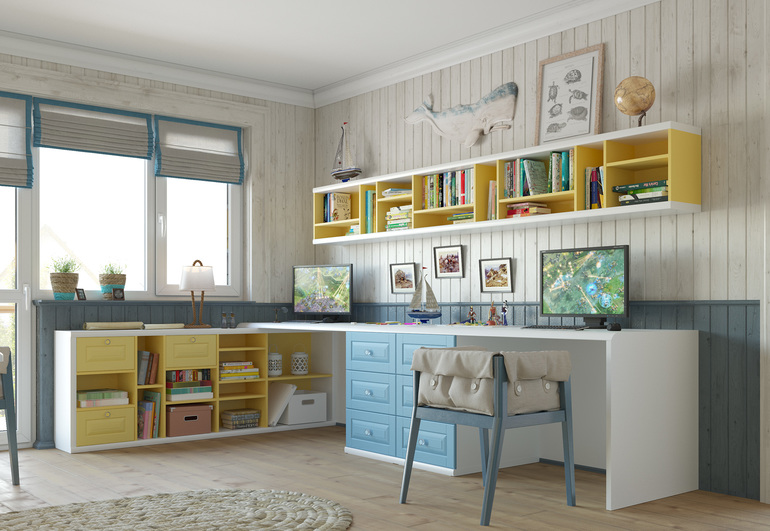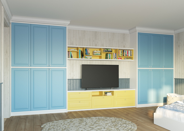 Основной шкаф в детской комнате - очень спорное решение. Очевдно, у вас есть еще и спальня, раз детям отдаете большую комнату? Почему там шкаф не сделаете?