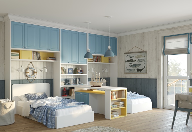 По левой стороне от двери 2 нормальные кровати, справа от окна стол, шкаф прямой. К стене перед дверью можно поставить стеллаж для игрушек.