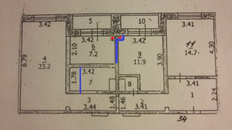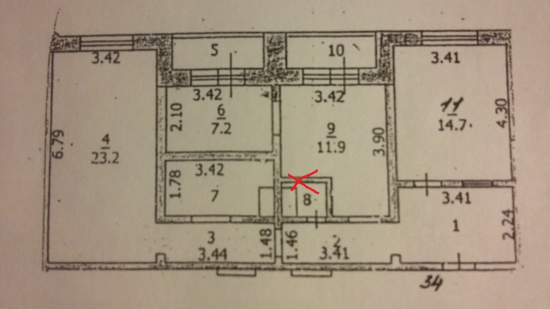 2) фото 3, снести туалет (8), перенесем унитаз в ванну. Комнату (9) сделать тем самым побольше... ну и оставить как есть, кухня-зал-столовая, где спать никто не будет. Но тогда есть некоторое непонимание, т.к. хотелось бы 2 спальни-детские и зал родителям, что и как грамотно сделать?... Комнату 11 хотели первому ребенку, а комнату 4 тогда родителям, но тогда нет комнаты еще малышу... Думали наоборот, комнату 4 сделать детской на 2-их детей, а 11 спальню родителям. Но туту момент,между детьми разниза в возрасте будет, один уже школьник, а другой малыш-новорожденный, пока один орет ночами, другому спать надо...