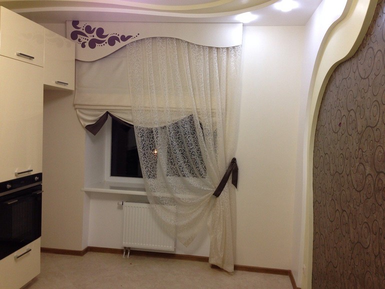 Самый удачный на мой взгляд вариант - римские шторы светлые с темным кантом в цвет плитки что-то типа такого Если решите заказать, могу посчитать полностью с карнизом, пошивом и тканью по ценам ниже салонных