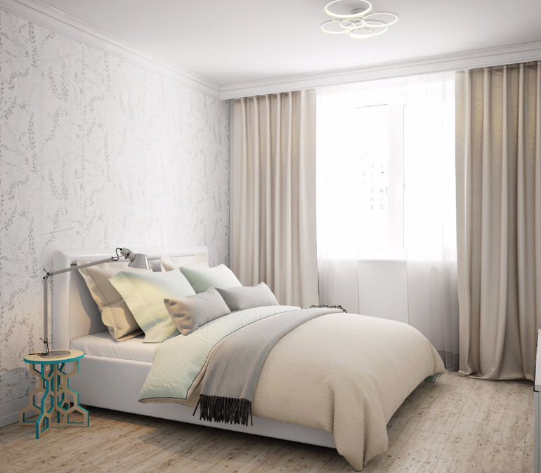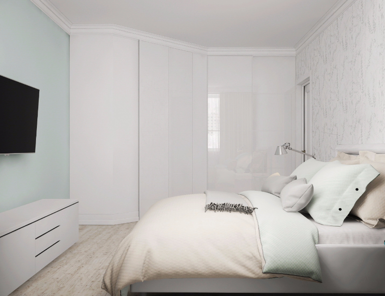 7. 15,1м2. Спальня с угловой гардеробной (2,7м2). Очень светлая, минимум мебели. Сканди-минимализм.