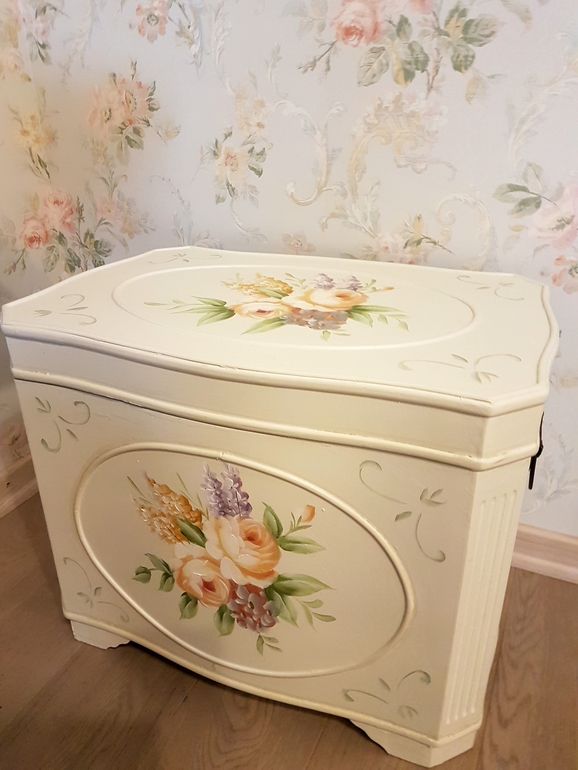 пока не прочитала текст, подумала что вы сделали на заказ сундук с таким же рисунком как и обои. Очень гармонично, не пестро!