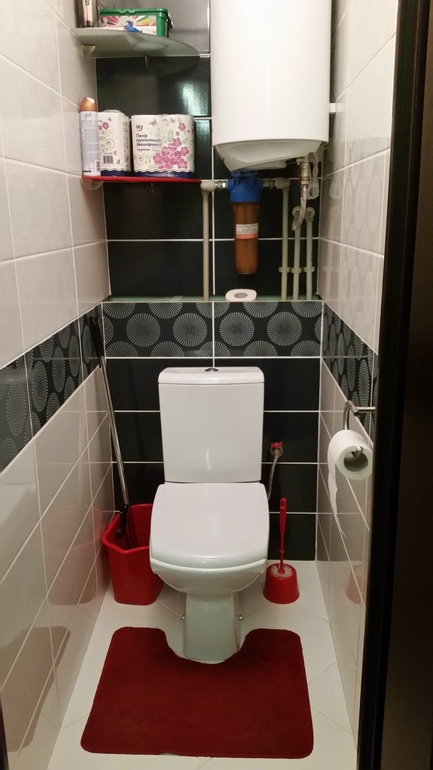 В туалете смотрится очень классно. Там по бокам белый декор, его на фото не видно, очень облагораживает. Вообще, кафель мне очень нравится. Он глазированный и не просто белый и синий, а с мелкими-мелкими цветочками. Зеркало немного не по центру сейчас, немного сдвинула шкафчик, т.к. справого боку тазик засунула. Моему перфекционизму это не мешает :) Не советую вешать полотенчик прямо рядом с раковиной. У нас так было на другой квартире. Как меня это бесило!!! Если есть место - лучше чуток дальше их разместить. А зеркала такие у нас делают где-то недалеко. Это Украина. Продаются в магазинах только такие с разными вариациями. Зеркалу, кстати, уже 11 лет. За размер плитки извиняюсь, она 50 на 20. И чего я решила, что она 60... Сорри... А вот 60 на 15,7 - это наше новое детище (уже в Севастополе) Ширина с\у 1,27 см, длина 1,9. А остальные стены будем делать бежевым глянцевым кафелем под мрамор размер 60 на 30. И не считаем, что это крупный размер для такого помещения. На счет раскладки - делайте, как вам больше нравится. Ведь по сути, это очень надолго делается. Удачи вам!