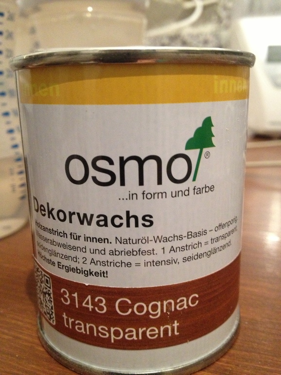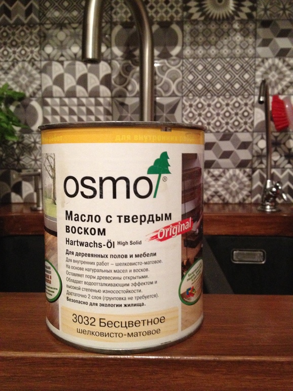 Сначала два слоя цветного масла Осмо. Вот такое у нас было (цвета бывают разные, это не тот цвет, который в ванной. Этим я кухонную покрывала)