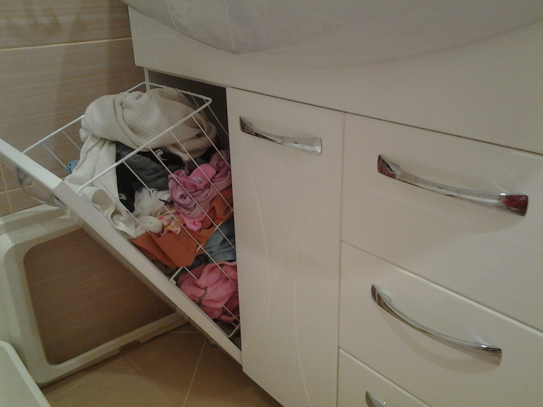 И второй вопрос, где храните грязное бельё? Отдельно стоящая корзина или корзина в шкафчике? В пеналах смотрятся корзинки совсем маленькими(((