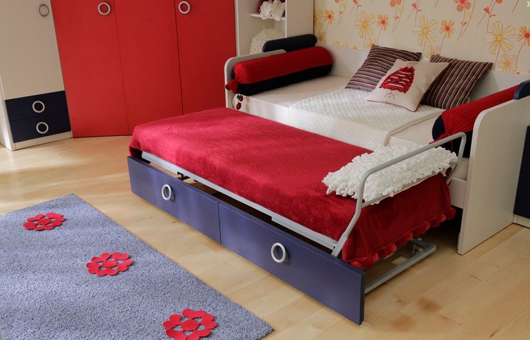 Интересует диковинка) Детская с выкатным спальным местом, чтобы нижнее место ставилось на уровень с верхним (механизм или основание на складных ножках). Материал лдсп мдф