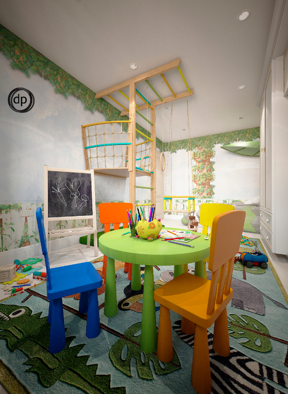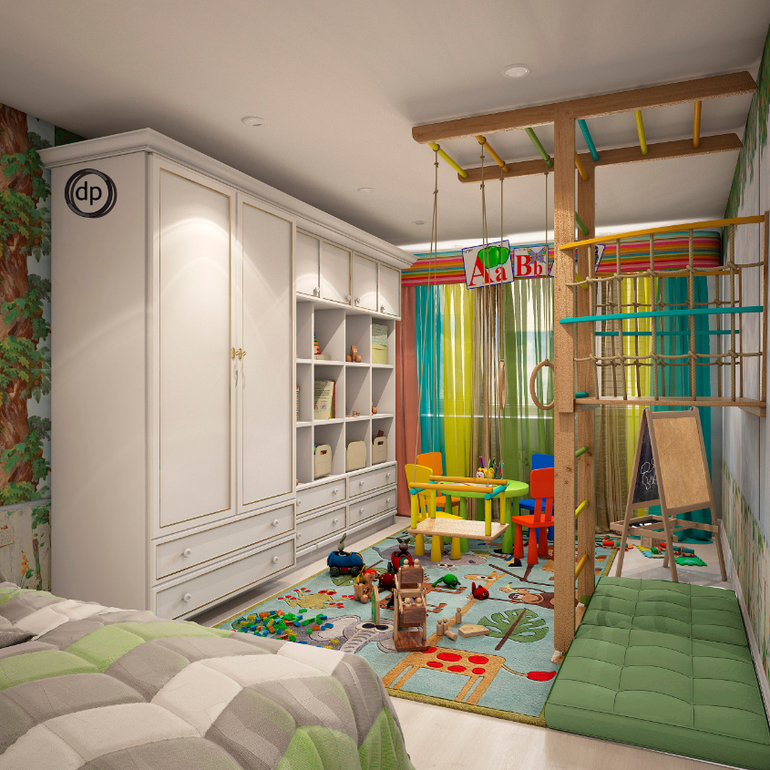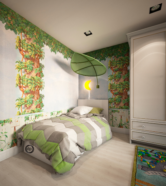 Вторая комната предназначена для двух мальчиков. И родители не хотели что-то новое и интересное. Поэтому, я предложила превратить комнату в джунгли, с собственным домиком на дереве.