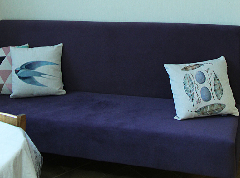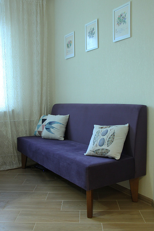 После этого была бессоннная ночь- я выбирала ткань для дивана, я сразу решила, что диван будет неким цветовым акцентом на моей бело-бежевой кухне. в цвет больших листьев на моей плитке- сине- фиолетовый. Не скрою, одиним из критериев выбора цвета была практичность- у меня двое детей - 9 месяцев и 8 лет, которые периодически проливают на себя и на мебель всякую еду:)) Может быть, если бы я жила одна, я бы выбрала нежно-бежевый цвет или белый:)