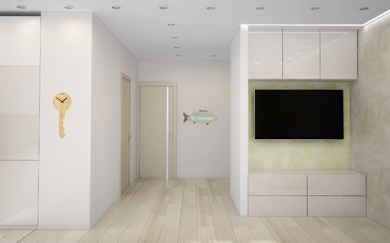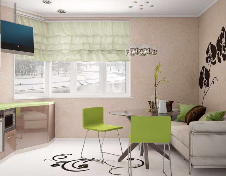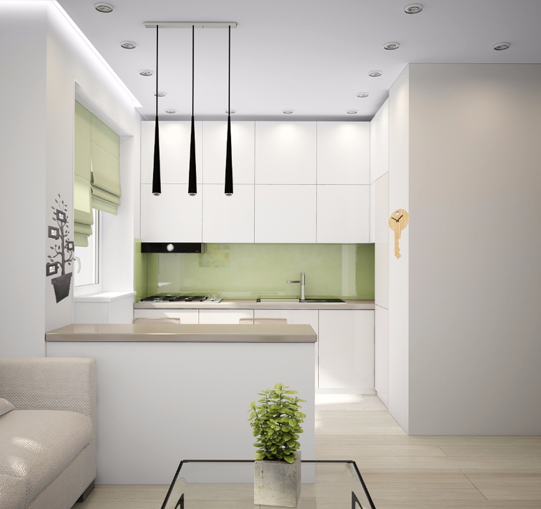 6. Кухня-гостиная, 18м2. Минималистичное пространство и по форме, и по цвету.