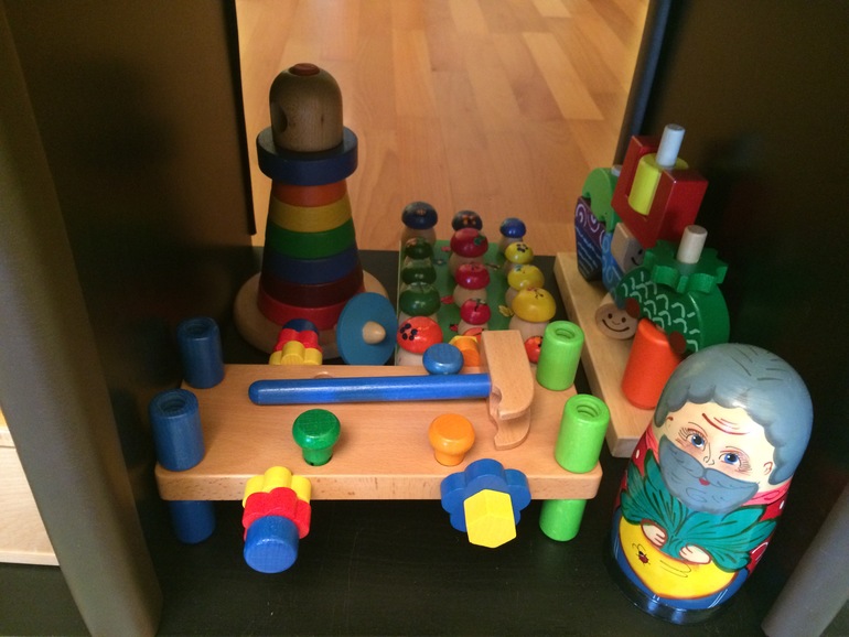Внизу я стараюсь хранить все тяжелое и деревянное, чтоб ребенок, таща что-то сверху, не покалечился.