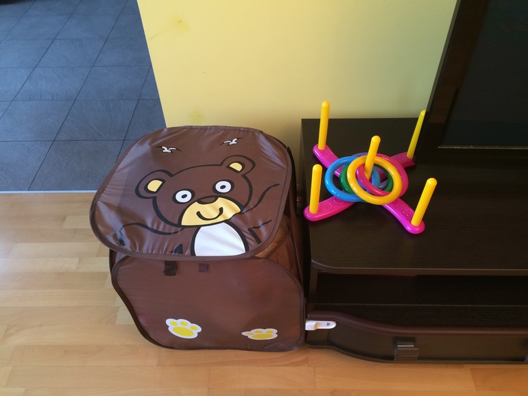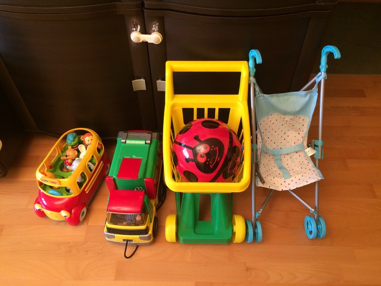 У нас пока нет детской, есть наша с мужем спальня. Там же спит и наш малыш. В этой комнате нет и не было никаких игрушек (кроме мобиля для самого маленького, ну а сейчас его сменил кот Басик, с которым спит малыш). Все игрушки хранятся в гостиной.