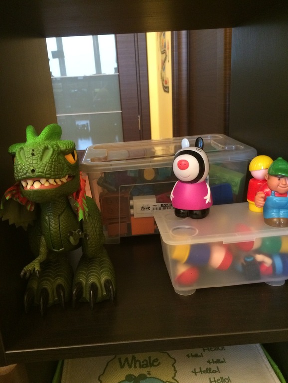 Тут наш любимый динозавр, Лего Дупло и всякие разные человечки (естественно разложенные по контейнерам Икея)