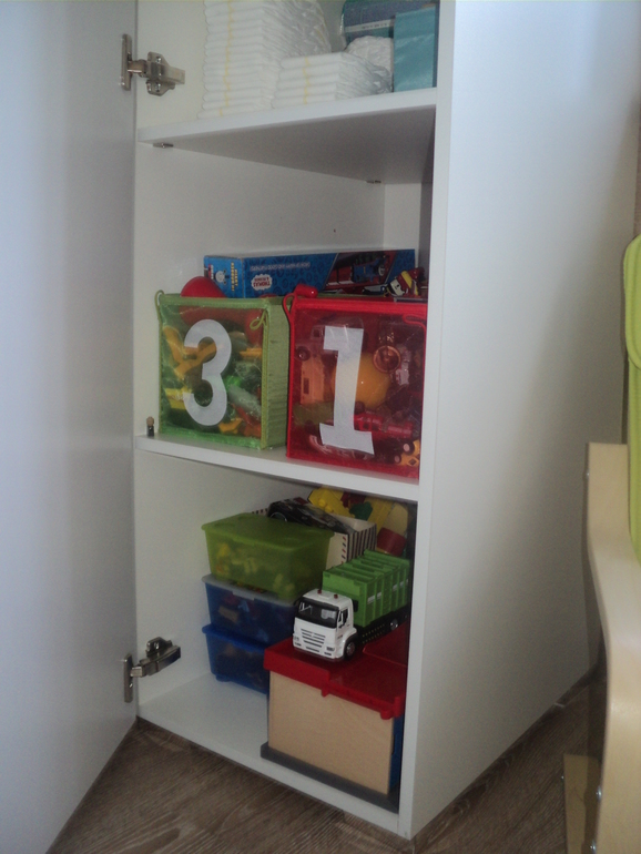 У меня сынок постарше-скоро пять,поэтому удобно.Рассортировано всё: в зелёном-роботы,в красном-маленькие машинки,в синем-зверушки)))) И если решил поиграть с машинками,то коробок переворачивает полностью
