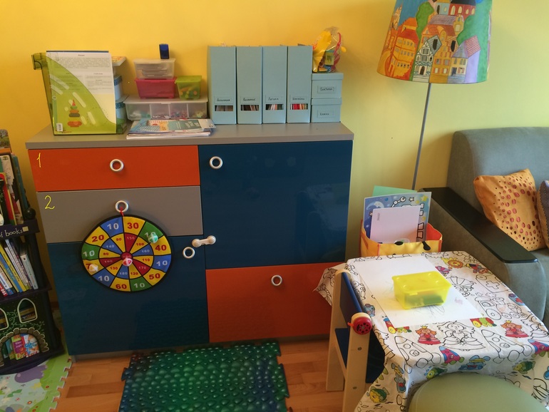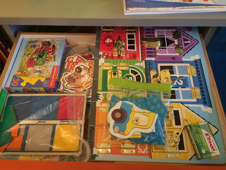 Этот комод жил в гостиной до появления Максима, но теперь все сверху и 2 ящика в нем занимают материалы для Макса. Сверху все для творчества: пособия по темам, пластилин, краски, всякие блестки/палочки/пайетки для аппликаций, бумага, карандаши. Еще там лежат пару наших пазлов, но основные залежи в комоде:
