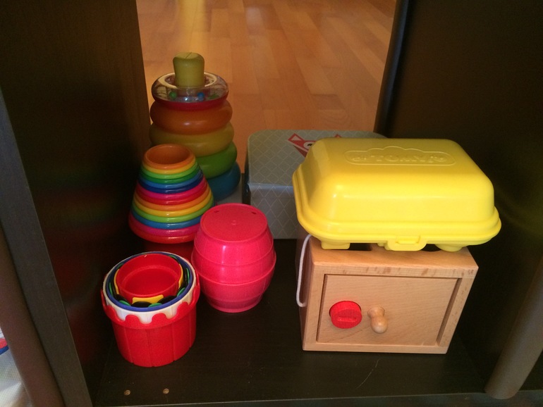 На стеллаже сверху стоят счеты, пианино и наши 2 игры: магнитная рыбалка и лото. Максим может вполне точно обозначить что ему оттуда снять (сам пока не достает)