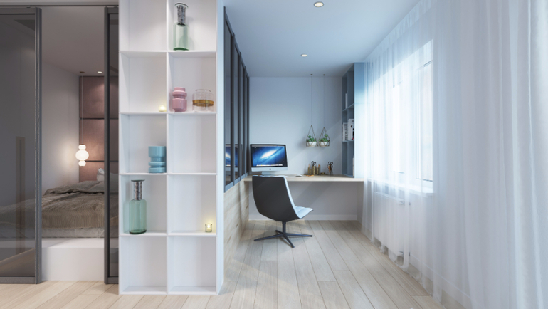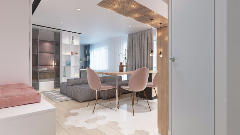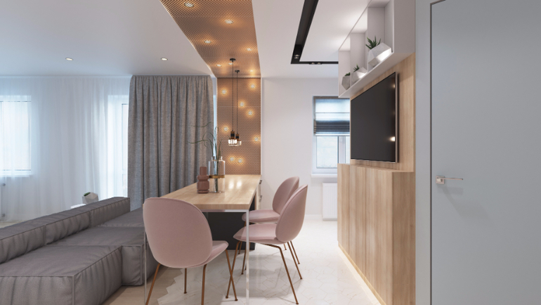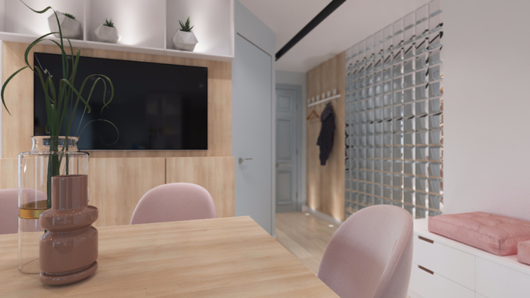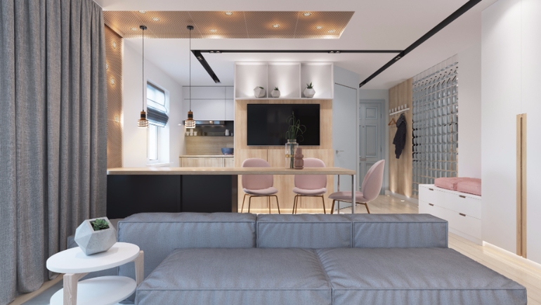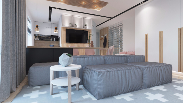 Исходными данными была небольшая площадь и желание заказчицы создать светлую уютную атмосферу и сделать пространство максимально открытым. При создании проекта было принято решение зонировать исходно небольшое пространство на 4 зоны: входную, жилую(зону дневного пребывания), зону отдыха(альков) и рабочую зону. Главным решением было демонтировать все перегородки.