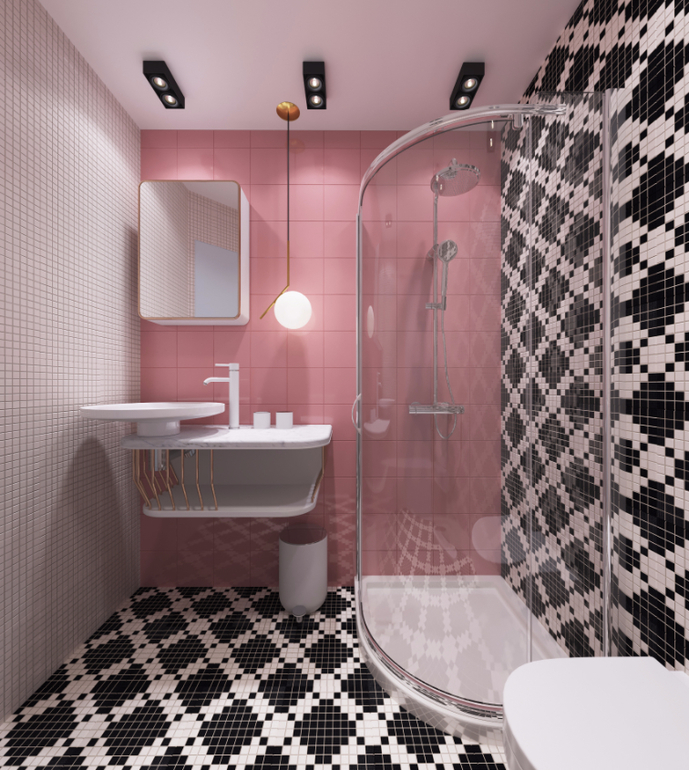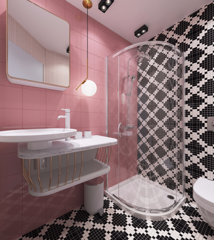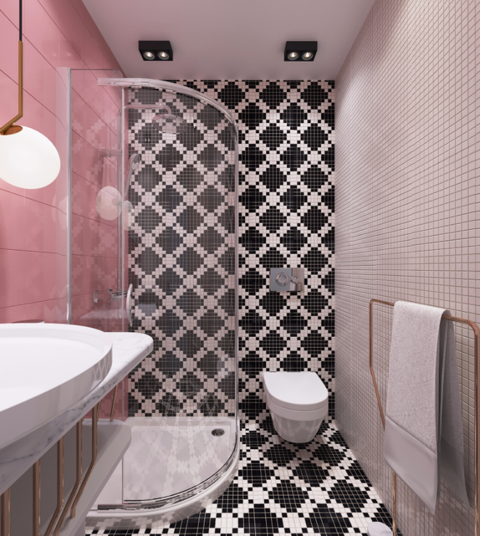 Также интересным решением было использование зеркальной квадратной плитки и мягкого голубо-серого оттенка во входной зоне, что визуально расширило и освежило пространство
