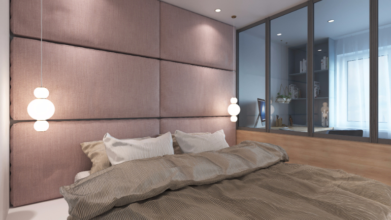 Спальную зону было решено не отделять сплошной перегородкой, а создать ощущение комфорта и уединенности посредством примененияфранцузского остекления.