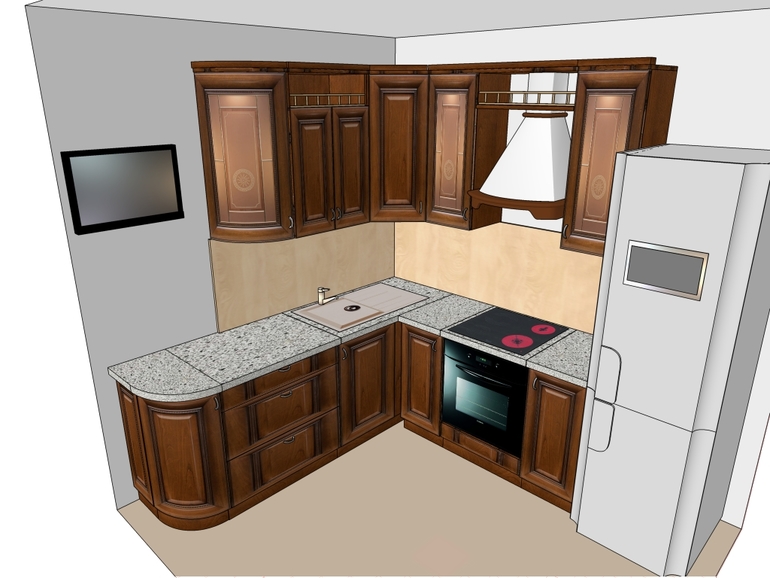 Заказала кухню цвета Черешня, прилагаю проект. Помогите пожалуйста определиться с обоями и напольной плиткой. Размер кухни - 9,7 кв.м. По плитке есть задумки ( планирую положить бежевую под ламинат Kerama Marazzi) но терзают сомнения..Так хотелось классическую кухню из массива, но как ее теперь обустроить и сделать уютной совсем нет представления. Также стоит вопрос со шторами, какие подойдут? И как оформить стену где будет висеть телевизор, обои или продолжить фартук. Хотелось бы рулонные. Возможно, у кого то есть похожая кухня. Буду признательна, если покажете фотографии.
