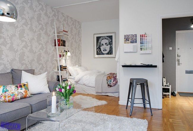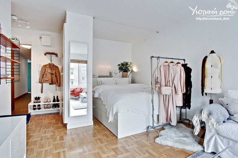 Да, конечно здорово, это решение для однокомнатной квартиры, но!!! каждый раз спускаться вниз кровати(в ноги), это реально неудобно, особенно ночью( сейчас у самой такой вариант), а так это решение проблемы