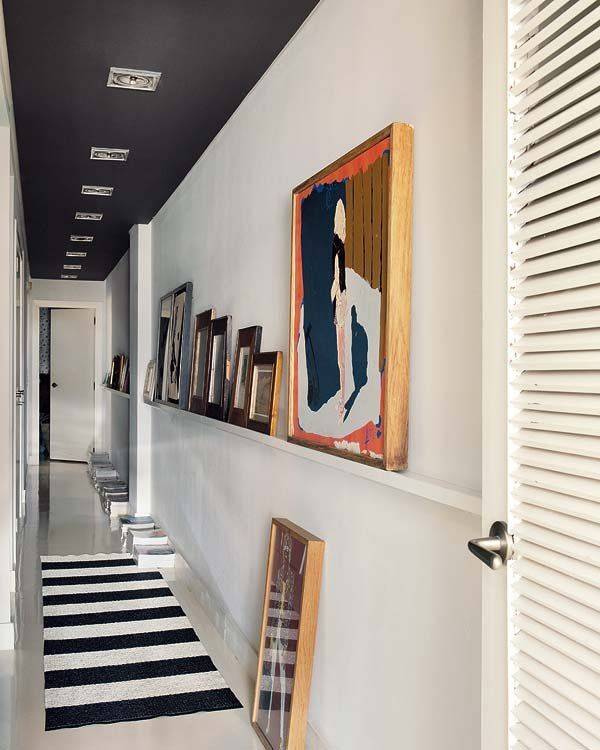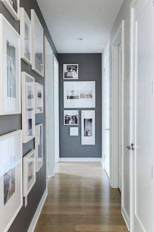 Рамки я бы повесила не в коридоре, а на стыке коридора и кухни. Так вы объедините эти 2 помещения.