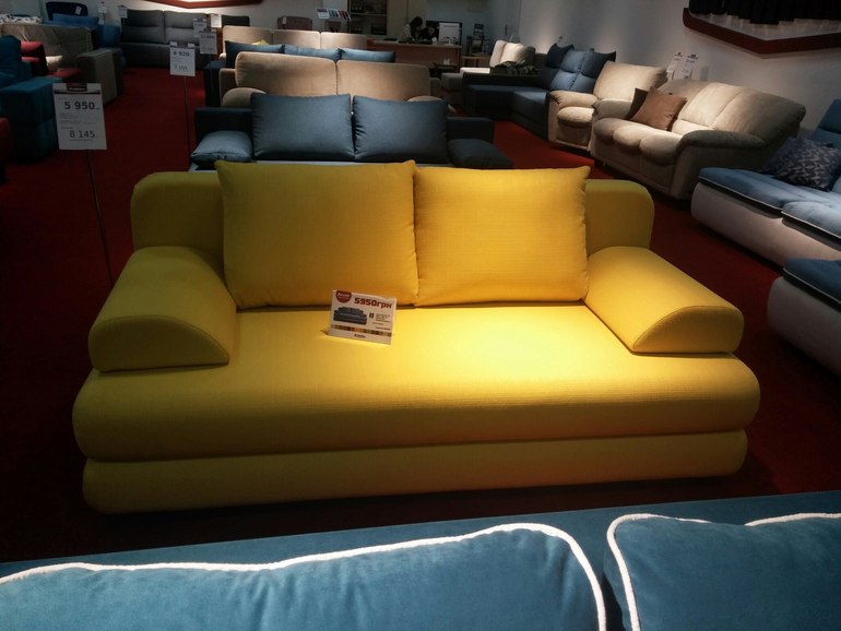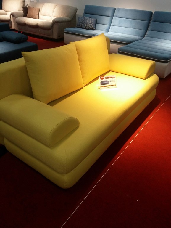 У меня был желтый диван, ярко, красиво, но если будете на нем спать то не стелите цветное постельное белье
