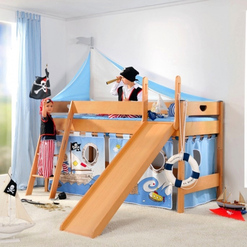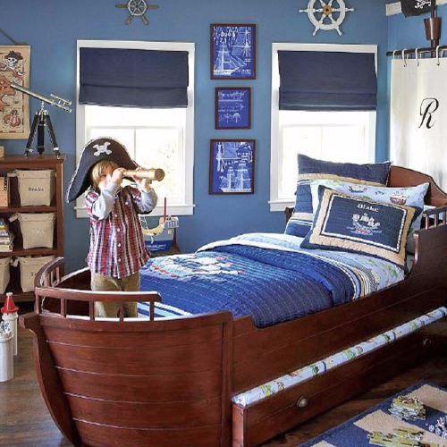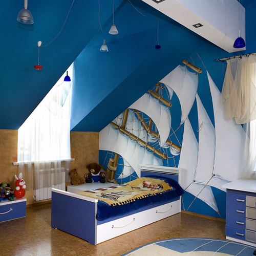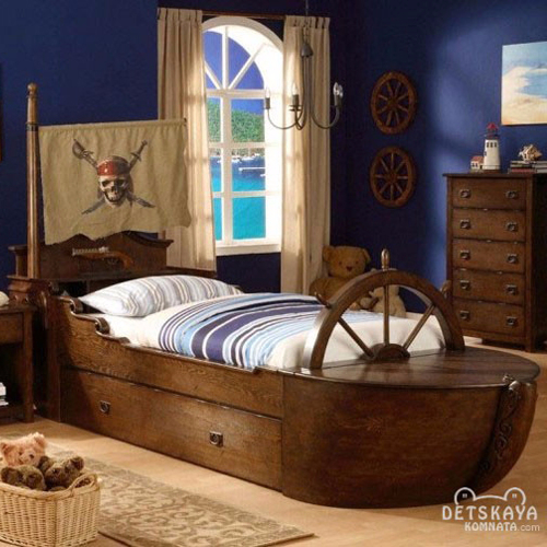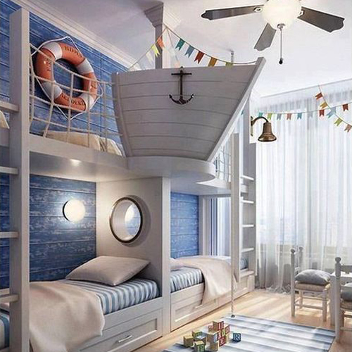 Одни из самых эффектных, но, одновременно, трудо- и финансово-затратных вариантов, это детские, буквально транслирующие морской стиль. В таких пространствах располагаются кровати, по форме и содержанию очень сильно напоминающие корабль, а все свободное место заполняются «пиратскими» сундуками, картами, штурвалами, плюшевыми осьминогами и акулами, а на стенах и полах изображают капитанские карты или океанических обитателей.