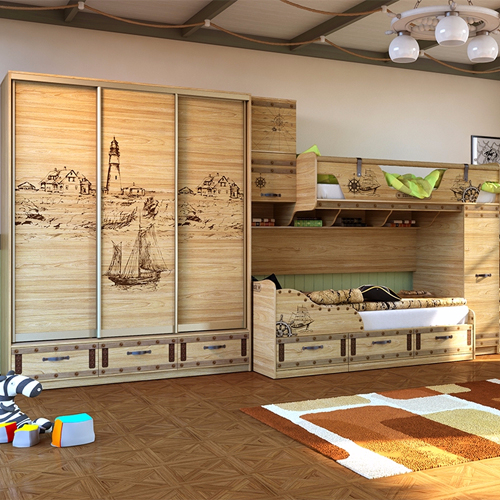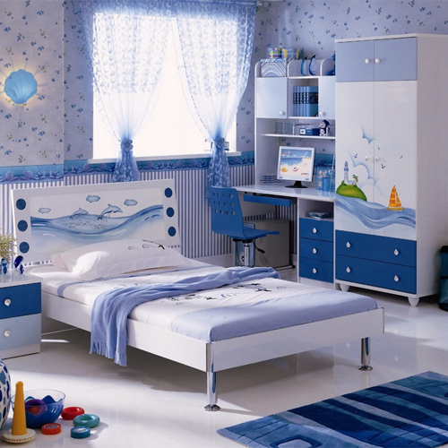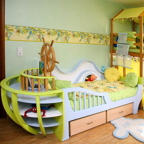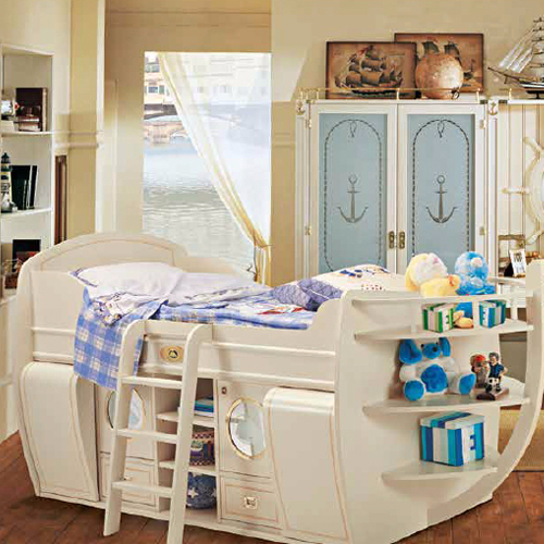 Мебель с рисунком на морскую тему - тоже популярный вариант оформления детской. В особенности хорошо использовать мебель с рисунками в том случае, если детская комната оформляется на несколько лет - ведь кровати с рисунком могут надоесть не только родителям, но и самому ребёнку. В любом случае, более стильно смотрятся кровати с небольшими лаконичными рисунками, в идеале - нарисованными художником вручную.