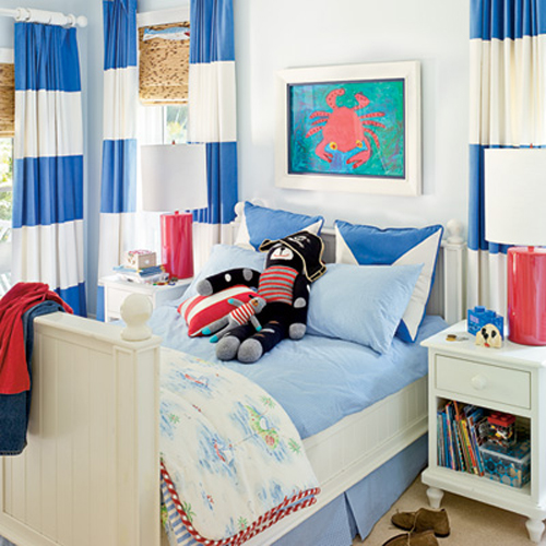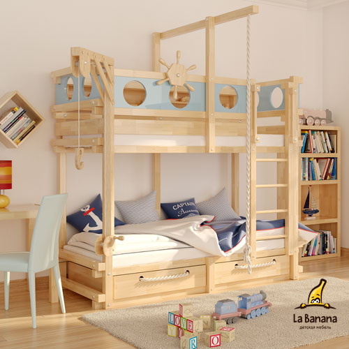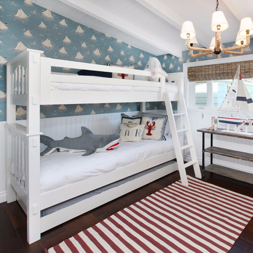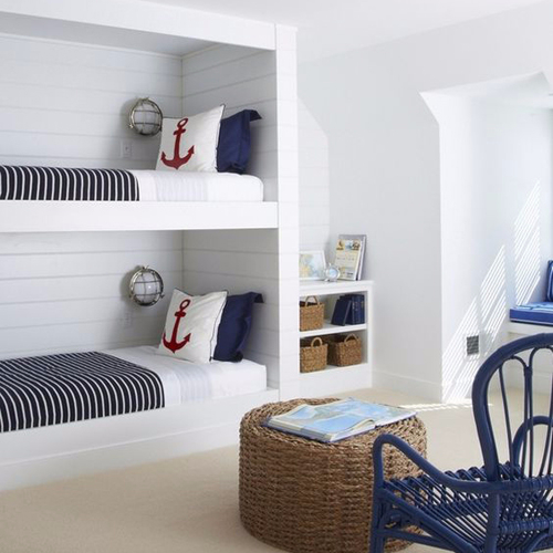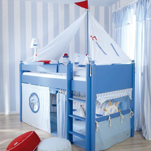Вариант более функциональный и менее экстравагантный - это детские, где морской стиль выражается в большей степени в аксессуарах и декоративных элементах мебели.