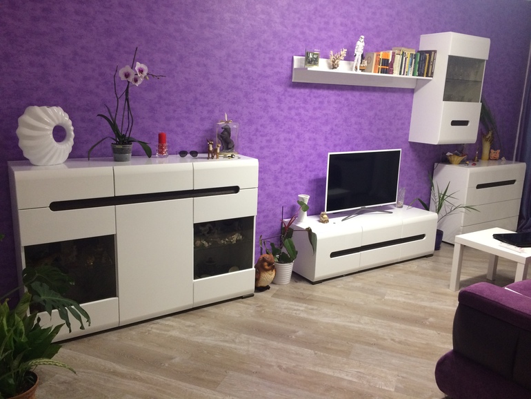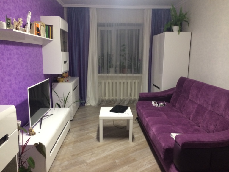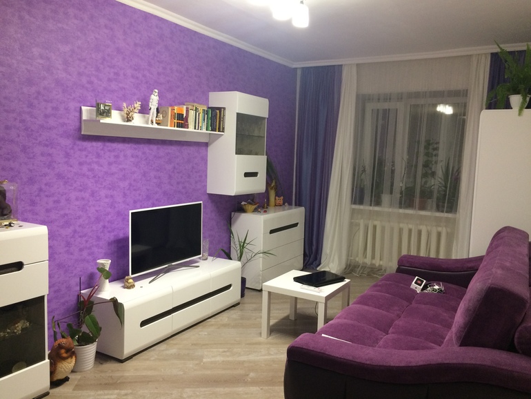 Наконец то увидела фото, что у кого та есть такой набор мебели как и у меня. У меня все фиолетово-белое. Со шторами не заморачивалась, повесила просто первую очень тонкую кристальную органзу, вторые белые шторы и третье фиолето-хамельон органза. Диван тоже фиолетовый.