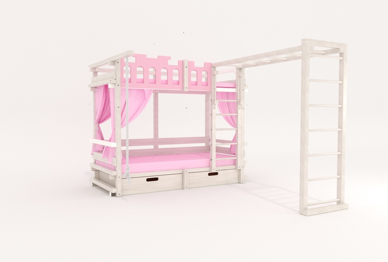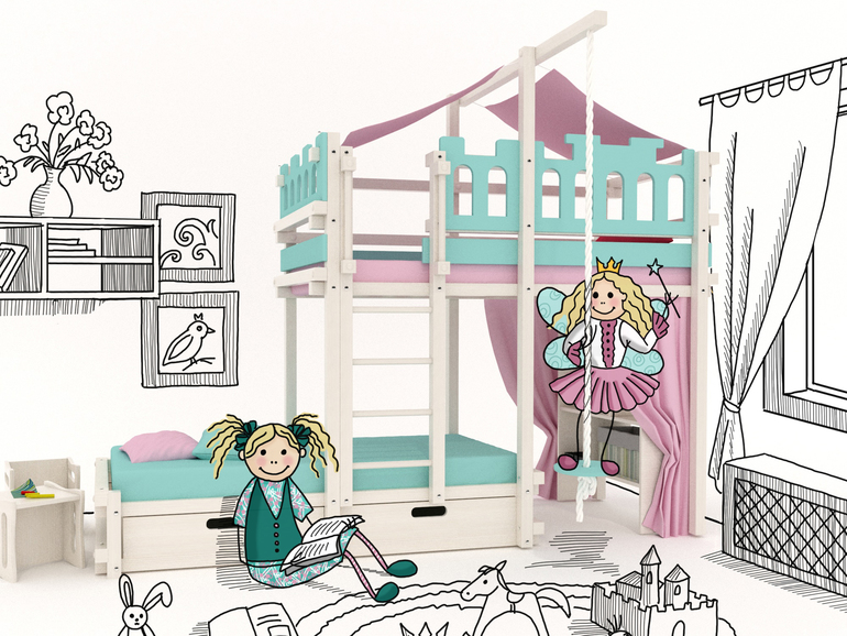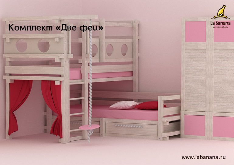 Мы можем из массива бука. Спальные места могут быть расположены одно под другим, или углом, или со смещением, как на последнем фото. Также сейчас появился вариант декоративного щита в виде кареты. Еще есть красивый текстиль для девочек - из кровати можно сделать "домик" с уютными розовыми шторками и сверкающими бусинками, подушечками разными... В общем, приглашаю на сайт http://labanana.ru и в Три Кита на 4 этаж ) Нарисуем проект индивидуально, бесплатно. В ближайшие выходные будет "Ночь продаж", скидки...