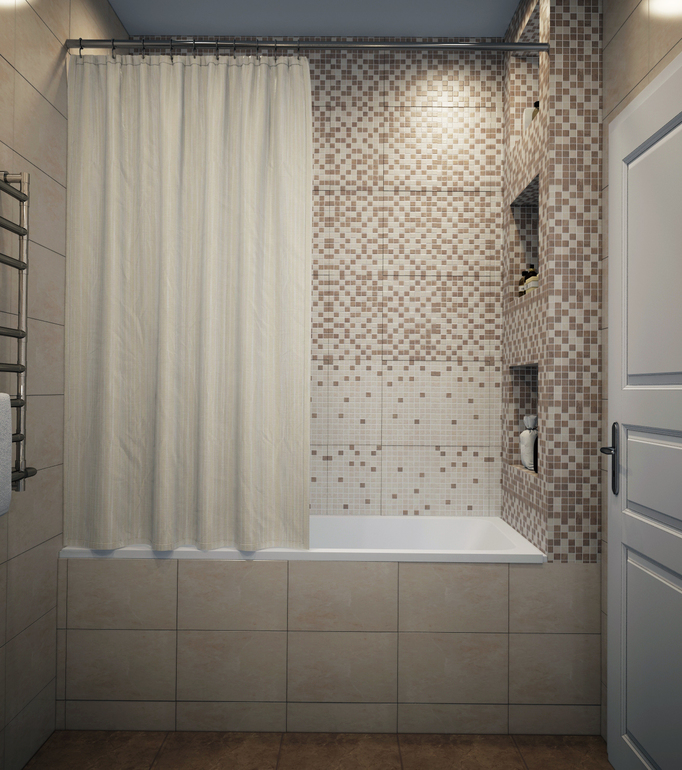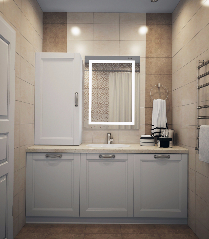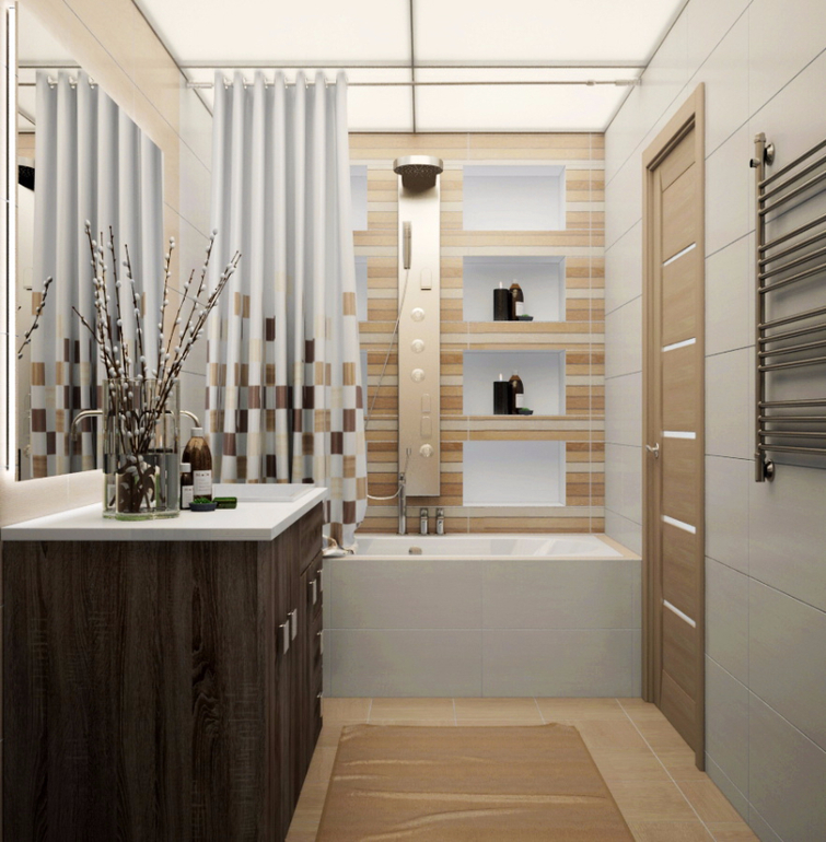 4. Ванна 5,3 м2. Теплые, уютные цвета. Подсветка зеркала. Ниши в стене.