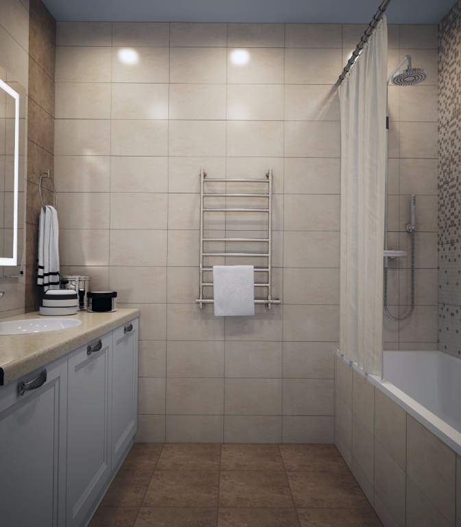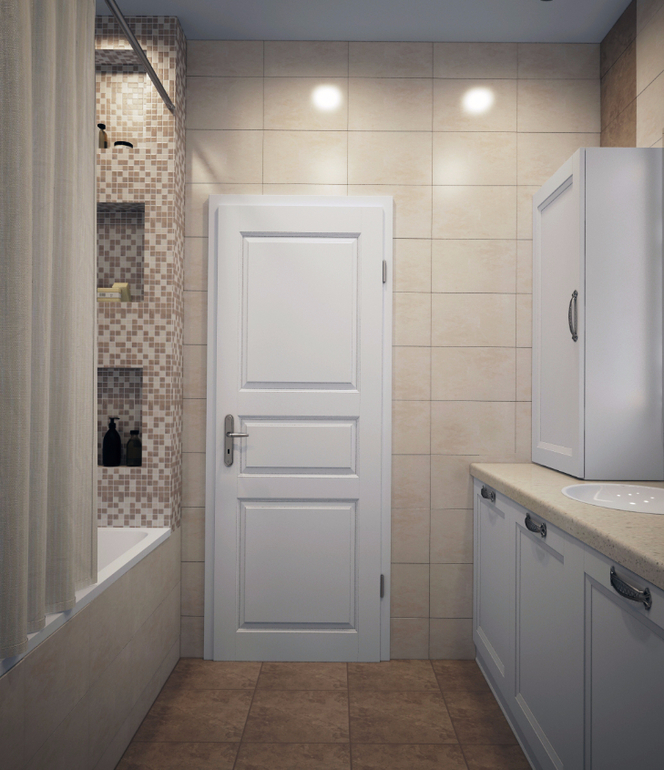 2. Ванна 3,8 м2. Двушка. Спокойные светлые тона. В целом, прохладный интерьер выдержан во всей квартире.