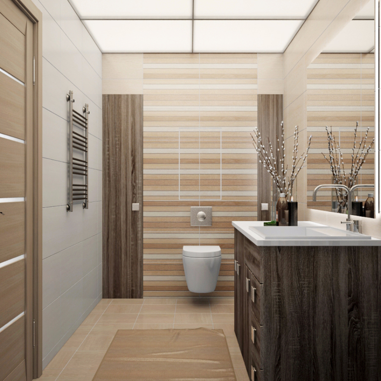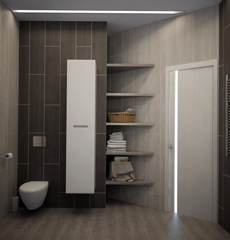 3. Совмещенный санузел, 6,8м2. Интересная подсветка потолка, встроенные шкафы, ниши. "Деревянный интерьер".