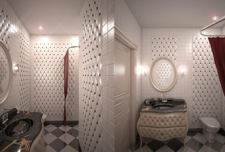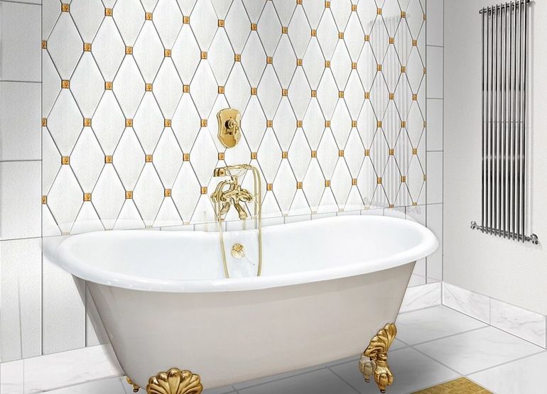 Дествительно модная плитка в ванную, да и на фартук кухни сейчас не кабанчик, а белая выпуклая плитка ромбом с золотыми или серебрянными вставками коллекция ЗИН СУ. Посмотрите фото ванной плитка ромб, Она выглядит просто!!!- Как? - Каждый длясебя продолжит!!!