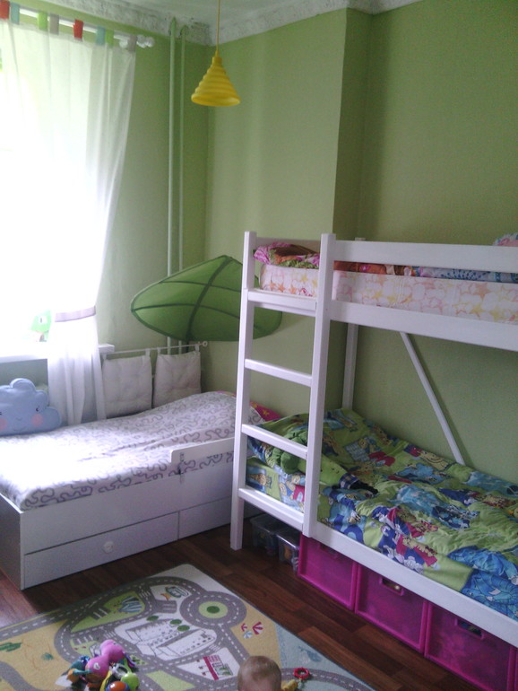 я тоже долго думала ставить у окна или нет. все таки не очень правильно, и в будущем там планируется, что будет спать младшая дочка. но когда 3 детей, и 1 комната, выбирать не приходится.