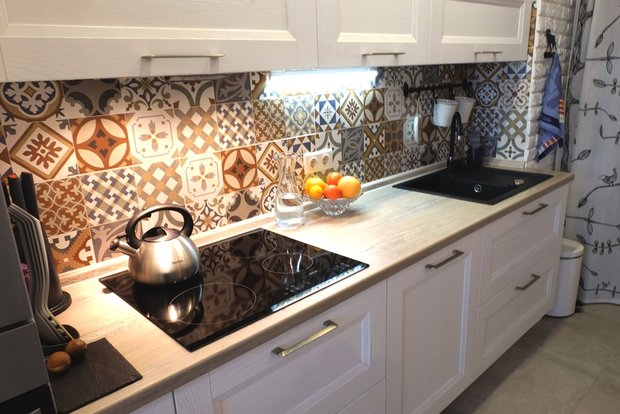 само по себе очень нравится,и именно тем, что рисунок не на всю высоту фартука, а как бы продолжение столешницы