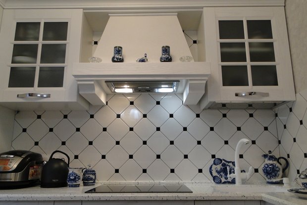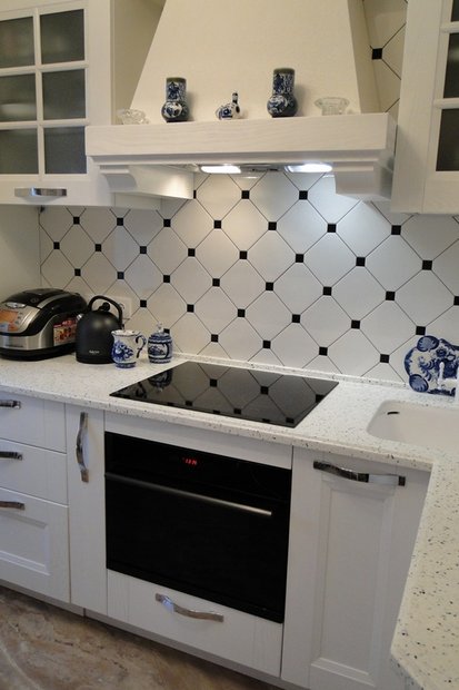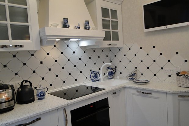 Ромбы, вроде, очень дорогая, то ли испанская, то ли итальянская плитка. Мне нравиться очень с пэчворком. А вообще, мне кажется, было бы очень хорошо черный фартук и черная столешница или черная столешница+белый фартук (лучше всего). Хотите еще покидаю?