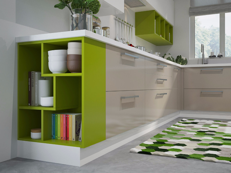 В мыслях белая глянцевая кухня, возможно угловая, со светло-зеленой столешницей и может быть еще и фартуком..