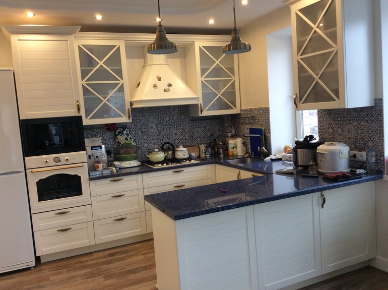 Кухня красивая, от фартука рябит в глазах. Он уже есть? Если еще не купили то лучше что то поспокойней.