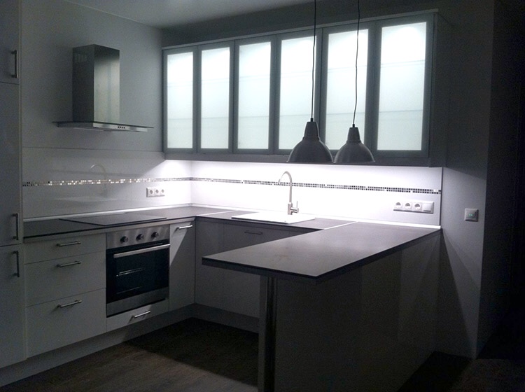 По полу слева на право: холодильник, высокий шкаф для хранения съестных запасов и заготовок, посудомойка, раковина, плита и варочная поверхность, выдвижной узкий шкаф, два шкафа по 60 с ящиками.