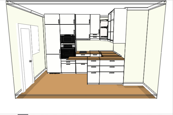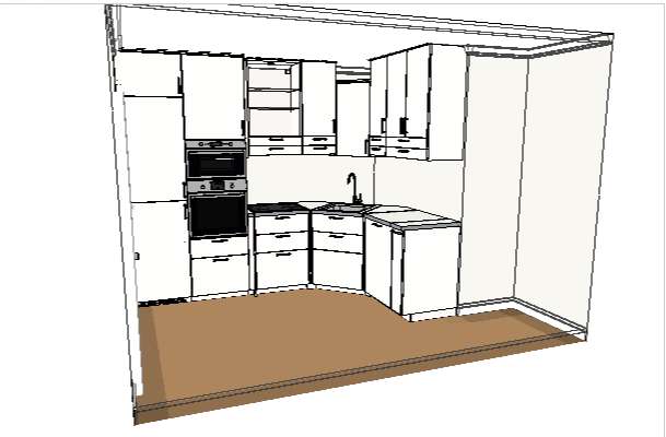Итак, нижние шкафы: холодильник, колона с микроволновой и духовым шкафом, шкаф под варочную поверхность, 40 под раковину с учетом того, что она уходит вправо под пустую столешницу, посудомойка, два 37-х шкафа (80 и 40 в ширину) с ящиками.