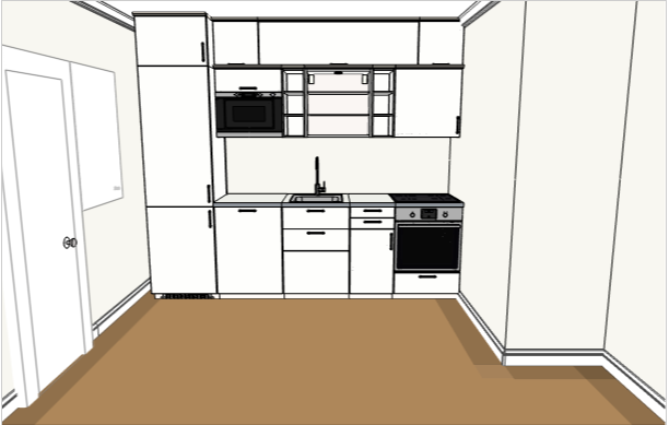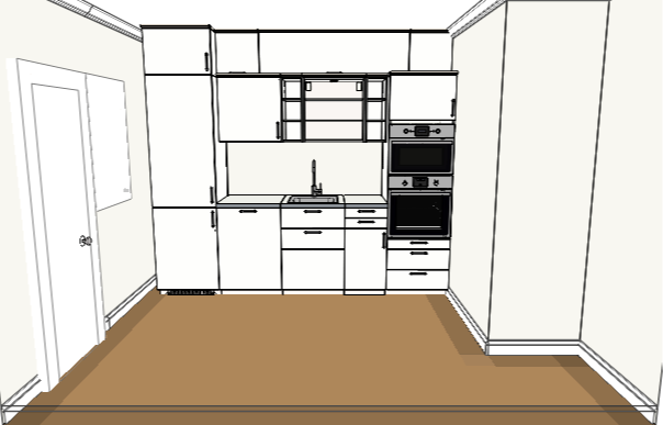Раковину отправляем ближе ко входу. Ставлю 60 под раковину и 20 выездную секцию. Тогда мне кажется получится неудачный рабочий треугольник. Но получаем длинную столешницу