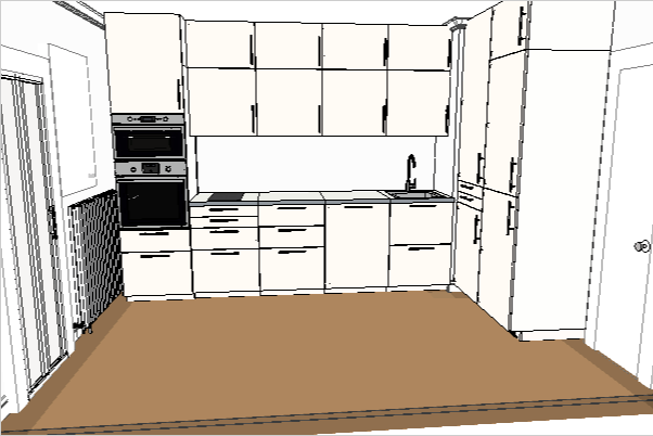 Мне нравится длинная столешница в центре. Разбивать её не хочется. Строила два угловых варианта и уводила столешницу под окно: не понравилось. Поняла, что хочу свободный доступ к балконному блоку.