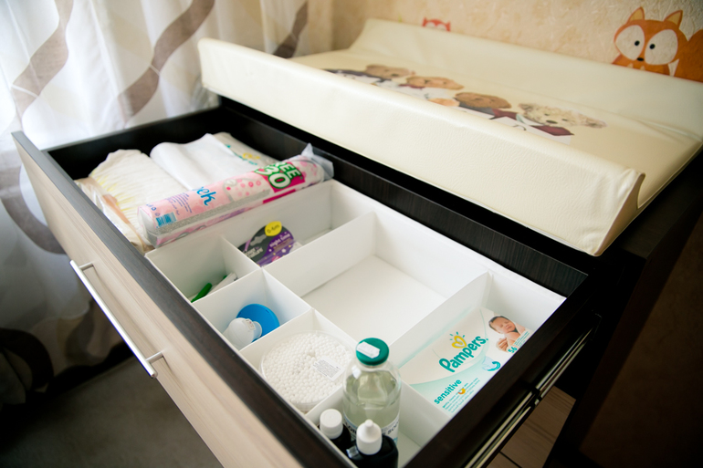 В комоде поместилась детская одежда на первые полгода + пеленки/полотенца. А верхний ящик заняли гигиентические принадлежности. Органайзер встал идеально - скубб из Икеи. Безумно люблю порядок и чтобы все было спрятано за дверцами, так что такое расположение кажется идеальным. Комод прибили к стене, естественно. А то завалился на меня таки разок.