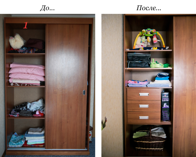 И наш шкаф внутри. Огромное расстояние между полками мне сразу неудобным показалось. А для малышковой одежды и подавно, так что заказали выдвижные ящички + разграничили пространство дополнительной полочкой. Теперь все удобно.