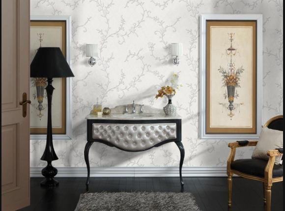 не надо цветочков, можно полоску если стены ровные и углы не полукруглые)))), можно на одну стену дамаск в молдинге, про цветочки забыть, мебель очень вычурная и так
